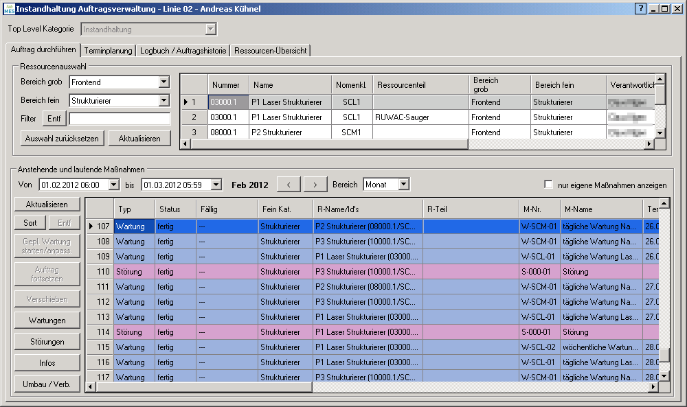 Mit der Auftragsverwaltung wird die tägliche Arbeit der Instandhaltung organisiert. Die vom System generierten Aufträge können in einer Feinplanung genauen Terminen und einzelnen Mitarbeitern zugeordnet werden. Der Mitarbeiter öffnet zur Instandhaltungsmaßnahme den Auftrag und kann ihm die durchzuführenden Arbeiten entnehmen. Mit der Buchung der Arbeit werden alle notwendigen Daten erfasst und protokolliert: