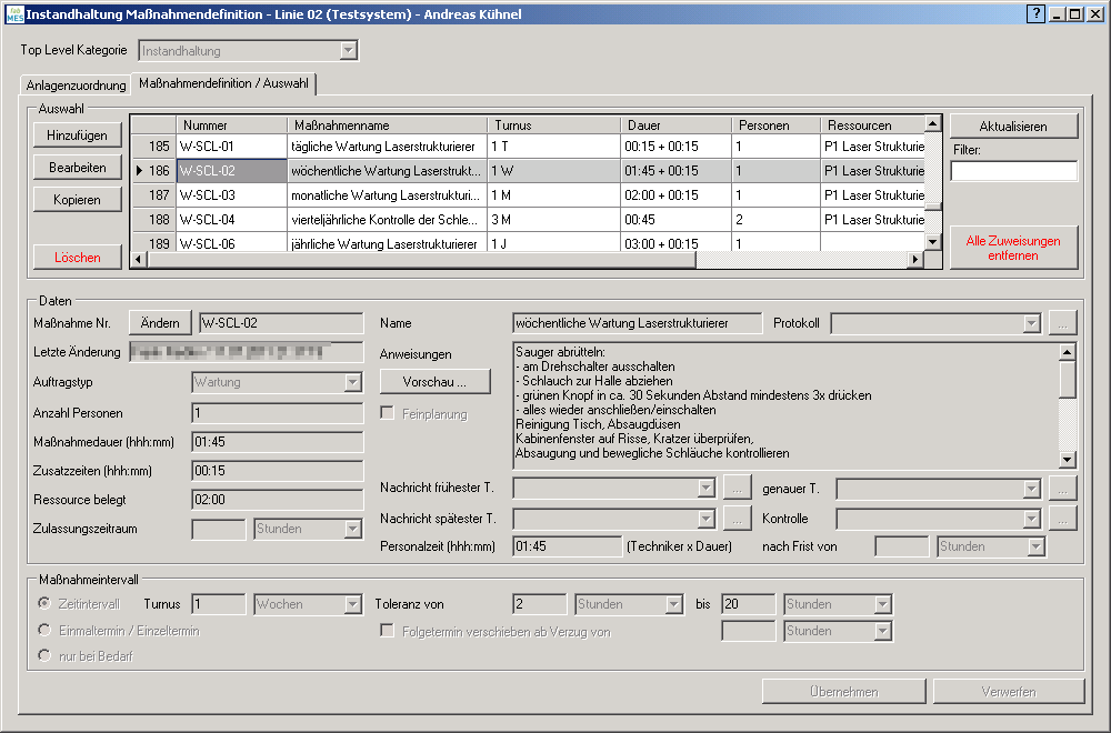 In den Maßnahmen werden neben dem auszuführenden Intervall Randbedingungen wie benötigte Ressourcen (Mitarbeiter, Zeit, Material) und Handlungsanweisungen hinterlegt (auch als Link auf bereits existierende Dokumente). Für das Intervall lassen sich Zeitfenster wie frühester oder spätester Termin näher definieren.