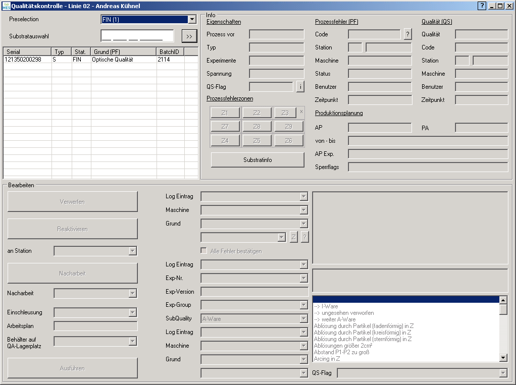 In einem Bearbeitungsdialog werden alle notwendigen Daten für die Bewertung der Qualität und zur Analyse der Ursachen bereitgestellt. Ebenso kann in diesem Dialog eine Entscheidung und Beauftragung der weiteren Vorgehensweise getroffen werden (Änderung der Qualitätsklasse, Nacharbeit, weiter prozessieren, Verschrotten etc.).